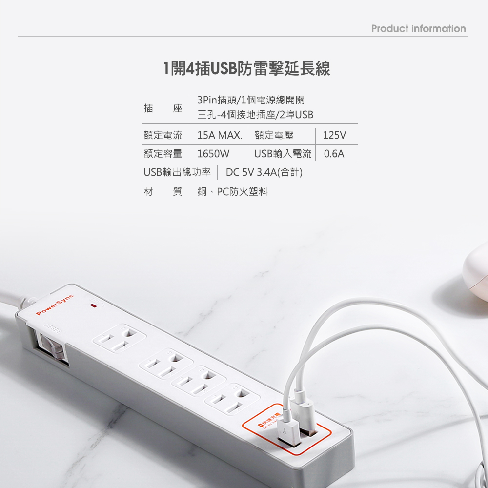 群加 一開4插USB防雷擊雙色延長線 1.8M TPS314GB9018A