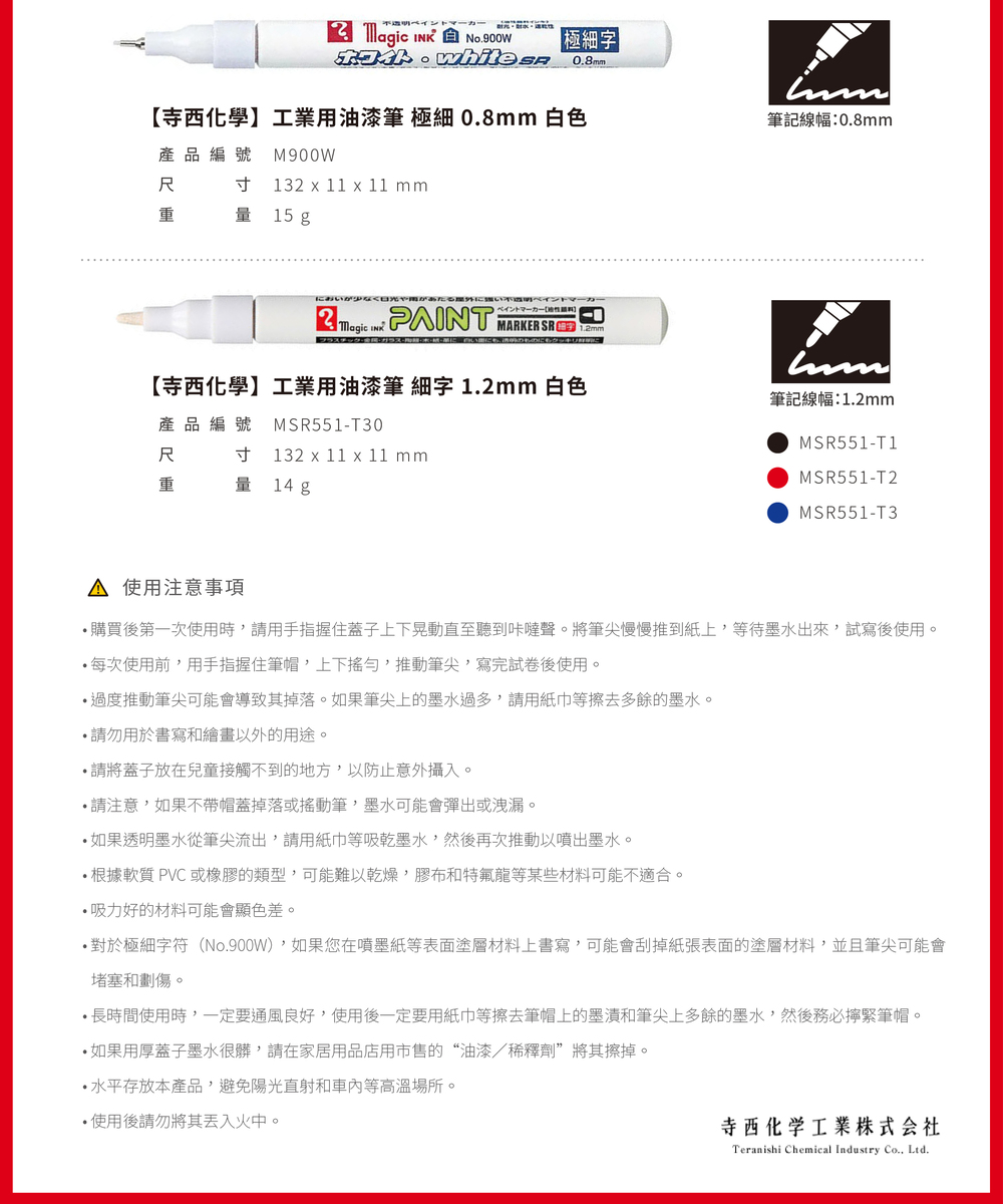 注意事項 ●除書寫和繪畫外,不能用於其他任何用途。 ●為防止意外吞下蓋子,請將其放在兒童接觸不到的地方。 ●不適合用於軟質PVC,某些橡膠,膠布和特氟龍。 ●沒有蓋而掉落或搖動可能會導致墨水洩漏。 ●請注意,墨水一旦沾到衣服上就不會輕易脫落。 ●請勿將其用完後扔入火中。 ●吸收良好的材料可能會使顏色變差。 ●請存放在遠離陽光直射和高溫的地方。 ●長時間使用後請通風良好,使用後請務必蓋上蓋子。