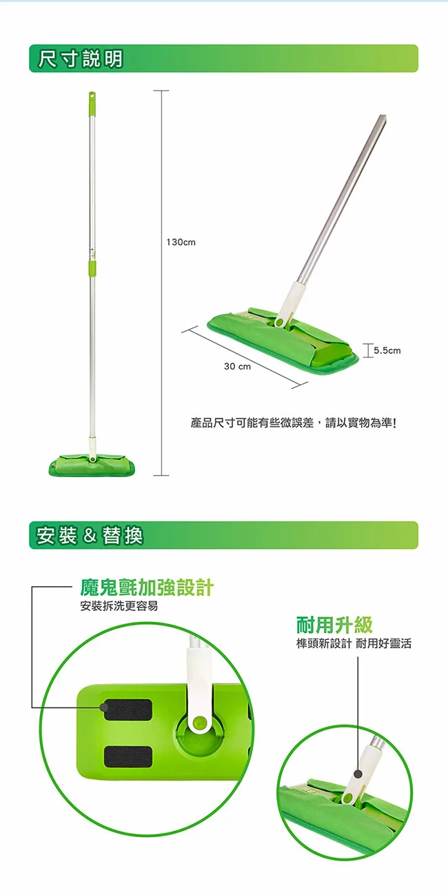 尺寸:拖把桿130 cm;拖把布30 x 12 cm