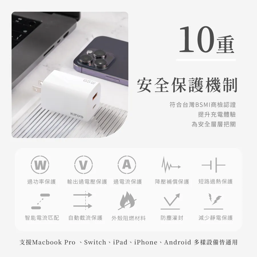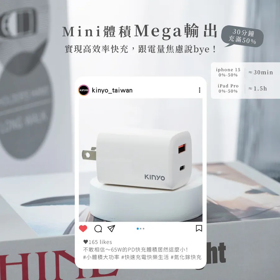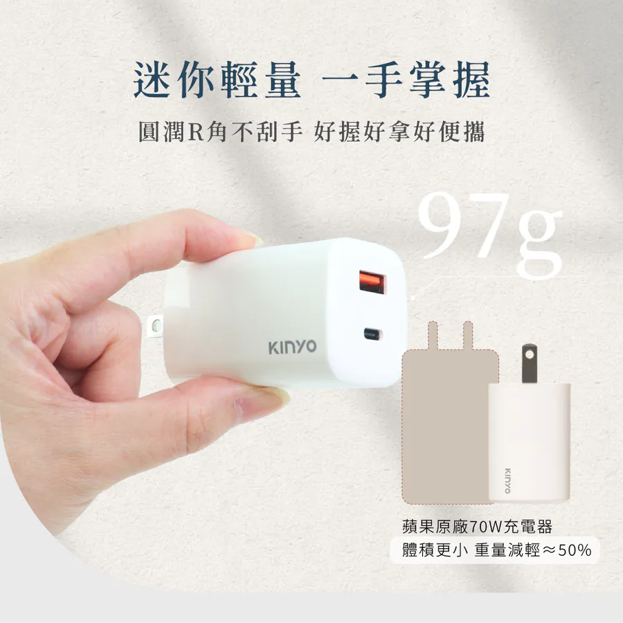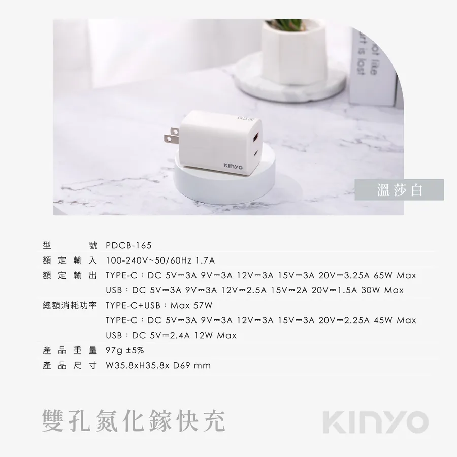 KINYO 氮化鎵雙孔PD充電器65W (PDCB-165)*特價*